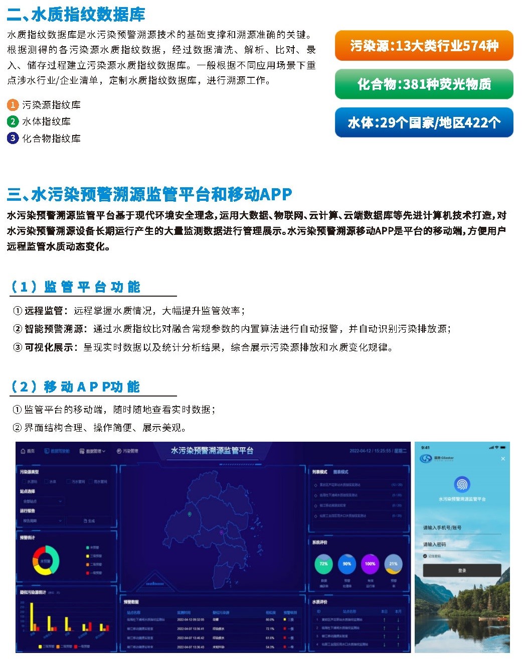 國內(nèi)外首創(chuàng)的水質(zhì)指紋污染溯源技術(shù)核心產(chǎn)品包括系列水污染預警溯源儀、水質(zhì)指紋數(shù)據(jù)庫、水污染預警溯源監(jiān)管平臺。利用系列水污染預警溯源儀進行水質(zhì)指紋測定,應用高速智能數(shù)據(jù)分析運算軟件進行指紋數(shù)據(jù)分析,通過與水質(zhì)指紋數(shù)據(jù)庫進行指紋比對,快速鎖定污染排放源。