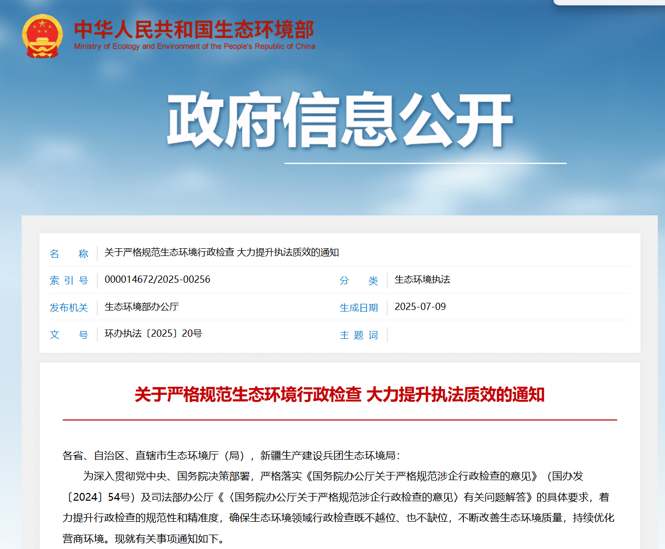 近日,生態(tài)環(huán)境部印發(fā)《關(guān)于嚴(yán)格規(guī)范生態(tài)環(huán)境行政檢查 大力提升執(zhí)法質(zhì)效的通知》(環(huán)辦執(zhí)法〔2025〕20號),就生態(tài)環(huán)境領(lǐng)域行政檢查工作作出全面規(guī)范。