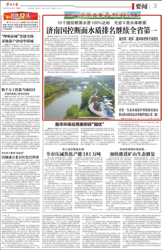 5月14日,濟南日報記者從市生態(tài)環(huán)境局獲悉,今年前四個月,濟南水質(zhì)改善再獲佳績,國控斷面水質(zhì)排名繼續(xù)保持全省第一,無劣五類水體斷面。全市10個國控斷面水質(zhì)100%達標,100%實現(xiàn)水質(zhì)類別提升,好三水體比例達到90%。